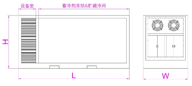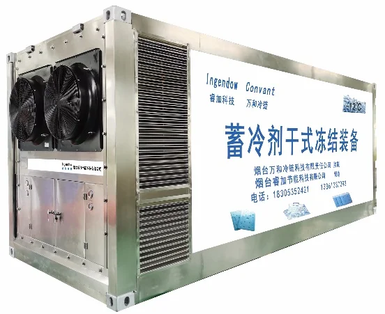 本裝備可移動式一體化干式擱架式蓄冷劑凍結裝備,箱體分別采用20尺、40尺高柜冷藏集裝箱改造,圍護結構保溫層采用聚氨酯保溫板,厚度δ=160mm,密度40Kg/m3,具有凍結與低溫貯藏雙功能。