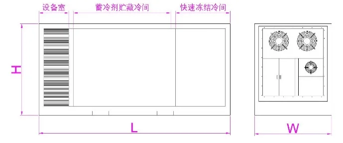 裝備可移動式一體化干式擱架式蓄冷劑凍結裝備,箱體分別采用20尺、40尺高柜冷藏集裝箱改造,分為設備間、凍結間、低溫貯藏間,冷間圍護結構保溫層采用聚氨酯保溫板,厚度δ=160mm,密度40Kg/m3。